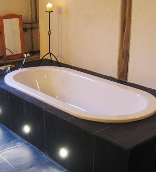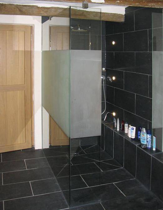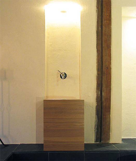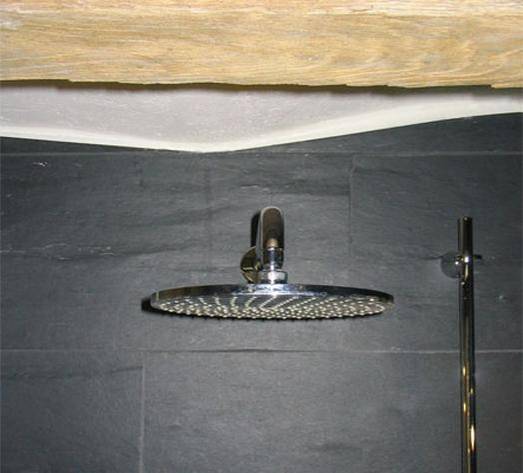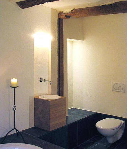 die beiden neuen bäder wurden in den nassbereichen mit geölten schieferplatten belegt. Die wandflächen sind, wie im gesamten haus, mit lehmputz verputzt, die alten eichenbalken wurden gesäubert, gebürstet und gekalkt.