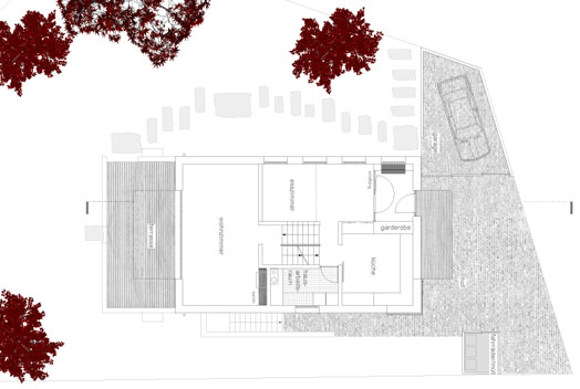 in den unteren ebenen befinden sich die allgemein genutzten räume, küche/essen/wohnen, mit direkt angeschlossenen außenflächen, terrasse-garten und hof.
